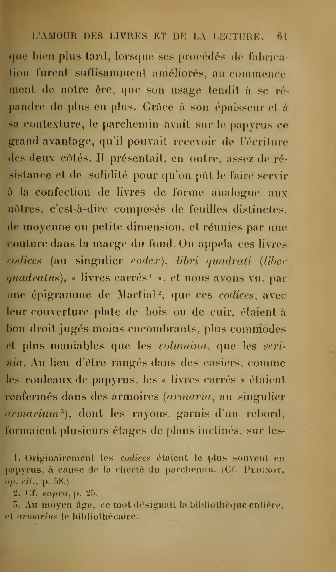 que bien plus tard, lorsque ses procédés de fabrication furent suffisamment améliorés, au commencement de notre ère, que son usage tendit à se répandre de plus en plus. Grâce à son épaisseur et à sa contexture, le parchemin avait sur le papyrus ce grand avantage, qu’il pouvait recevoir de l’écriture des deux côtés. Il présentait, en outre, assez de résistance et de solidité pour qu’on pût le faire servir à la confection de livres de forme analogue aux nôtres, c’est-à-dire composés de feuilles distinctes, de moyenne ou petite dimension, et réunies par une couture dans la marge du fond. On appela ces livres codices (au singulier codex), libri quadrati (liber quadratus), « livres carrés[061.1] », et nous avons vu, par une épigramme de Martial[061.2], que ces codices, avec leur couverture plate de bois ou de cuir, étaient à bon droit jugés moins encombrants, plus commodes et plus maniables que les volumina, que les scrinia. Au lieu d’être rangés dans des casiers, comme les rouleaux de papyrus, les « livres carrés » étaient renfermés dans des armoires (armaria, au singulier armarium[061.3]), dont les rayons, garnis d’un rebord, formaient plusieurs étages de plans inclinés, sur les-