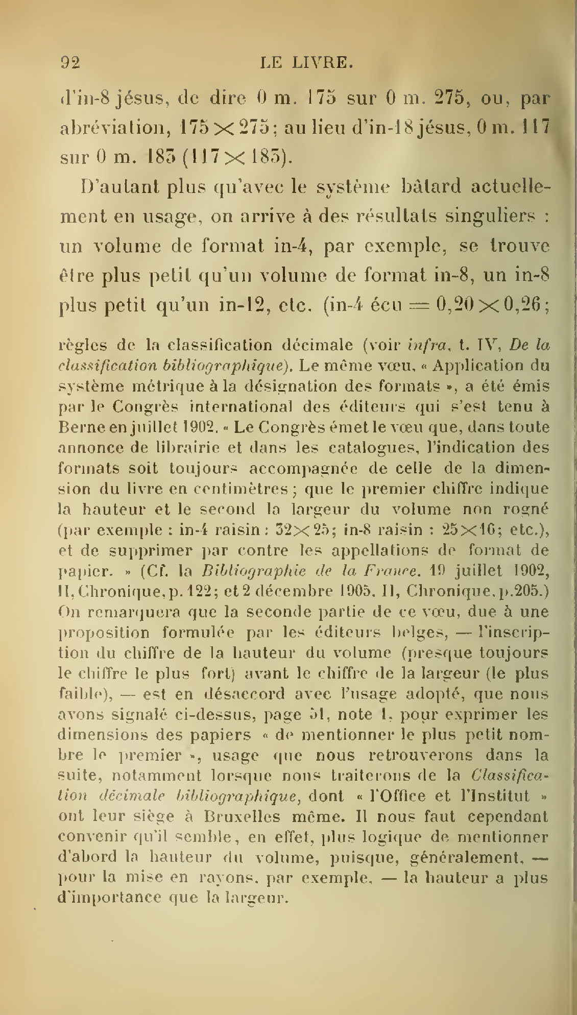 D’autant plus qu’avec le système bâtard actuellement en usage, on arrive à des résultats singuliers : un volume de format in-4, par exemple, se trouve être plus petit qu’un volume de format in-8, un in-8 plus petit qu’un in-12, etc. (in-4 écu = 0,20 × 0,26 ;